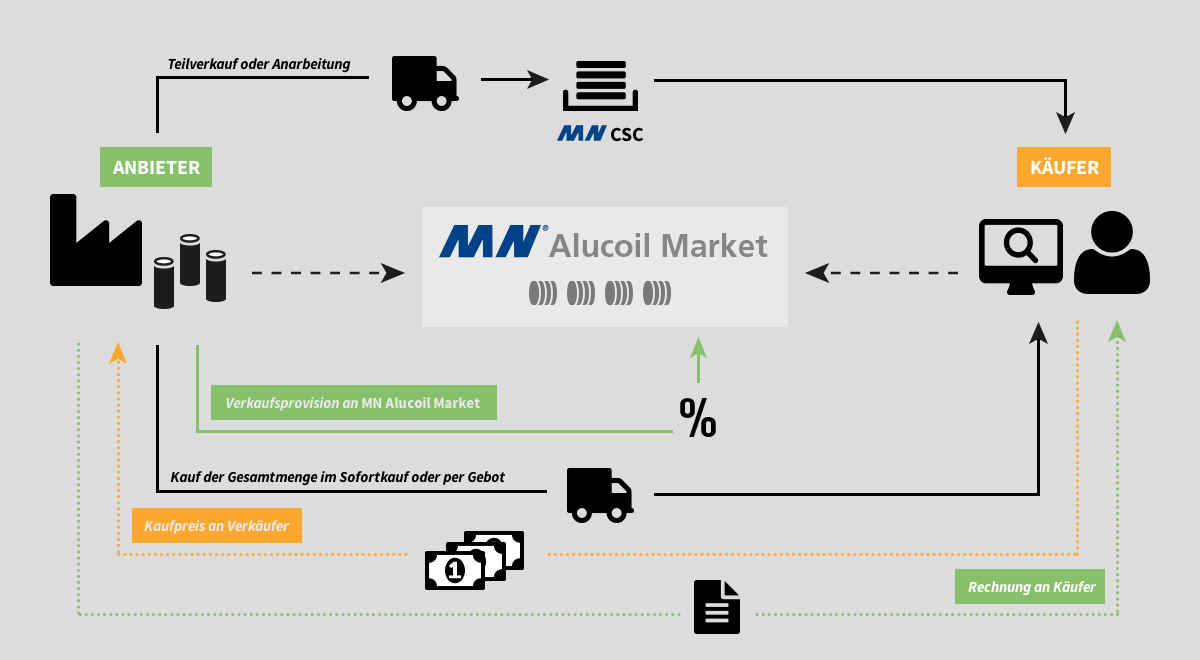 Die Zeiten, in denen Sie produktionsbedingte Überhänge oder Lagerbestände verschrotten müssen, gehören der Vergangenheit an. Auf MN Alucoil Market können Sie in Zukunft Ihre Lagerbestände, Teilmengen oder komplette Coils bequem zum Verkauf anbieten und somit Ihre Lagerbestände reduzieren und Kosten einsparen. Erstellen Sie dazu einfach ein Inserat mit allen relevanten Materialinformationen Ihres Alucoils, Zuschnitts oder Spaltbands. Sobald sich ein Interessent für den Kauf Ihrer Ware entscheidet, erhalten Sie dessen Kontaktdaten, um den Verkauf und die Abwicklung abzuschließen. Für den Service erhebt MN Alucoil Market eine Vermittlungsgebühr von 5% auf den Warenwert.